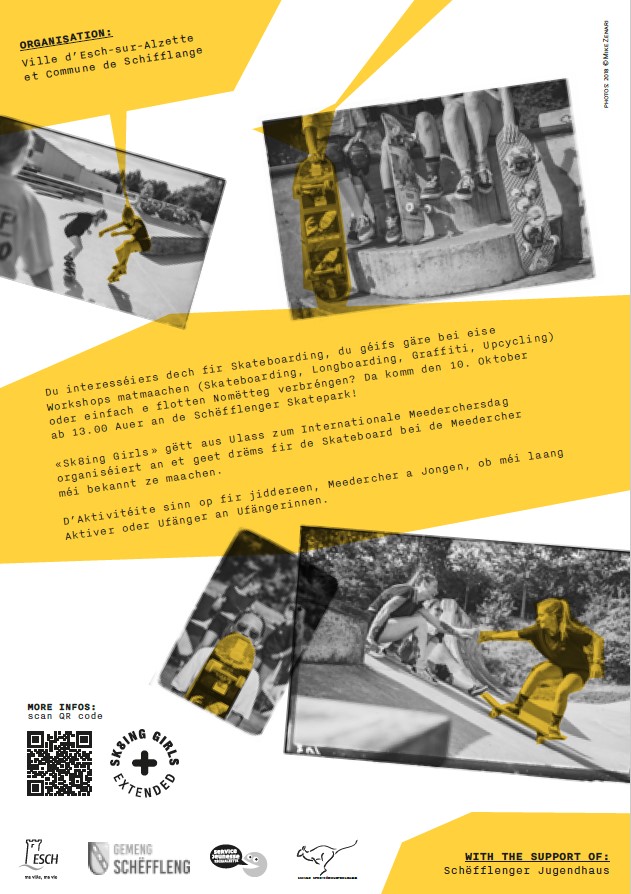 « Sk8ing Girls » gëtt am Kader vum Internationale Meederchersdag (11. Oktober 2022) organiséiert an et geet an éischter Linn drëms fir de Skateboard, e Sport dee vun de Männer a Jongen dominéiert gëtt, och bei de Meedercher méi bekannt ze maachen.