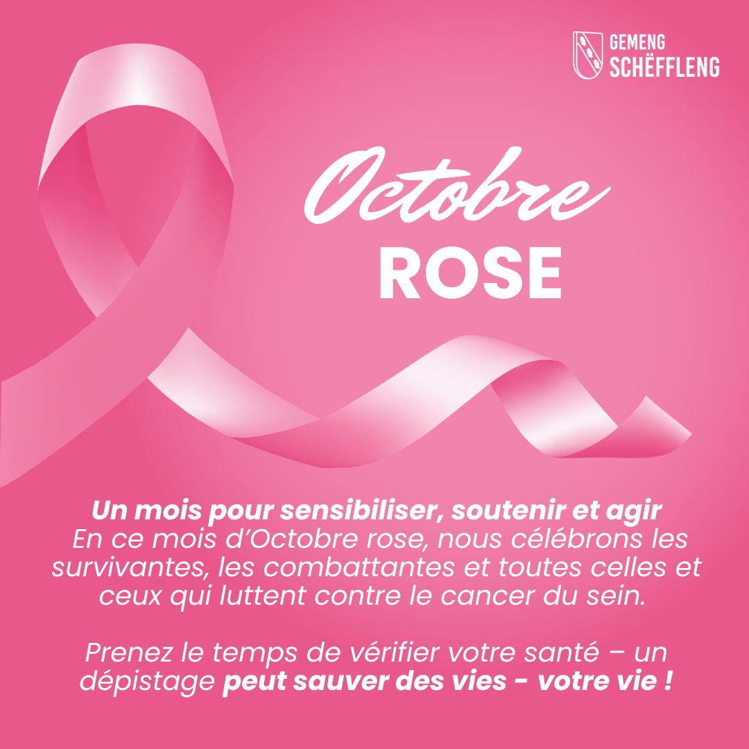 Am Kader vum Rosa Oktober, dem internationale Sensibiliséierungs-Mount géint Broschtkriibs, setzt d’Gemeng Schëffleng e staarke Message fir d’Wichtegkeet vum Depistage ze ënnersträichen. Eng fréi Erkennung vun Tumeure kann entscheedend sinn, fir Liewen ze retten. D’Gemeng engagéiert sech fir d’Bewosstsinn ze stäerken a Solidaritéit mat de Betraffenen ze weisen.
