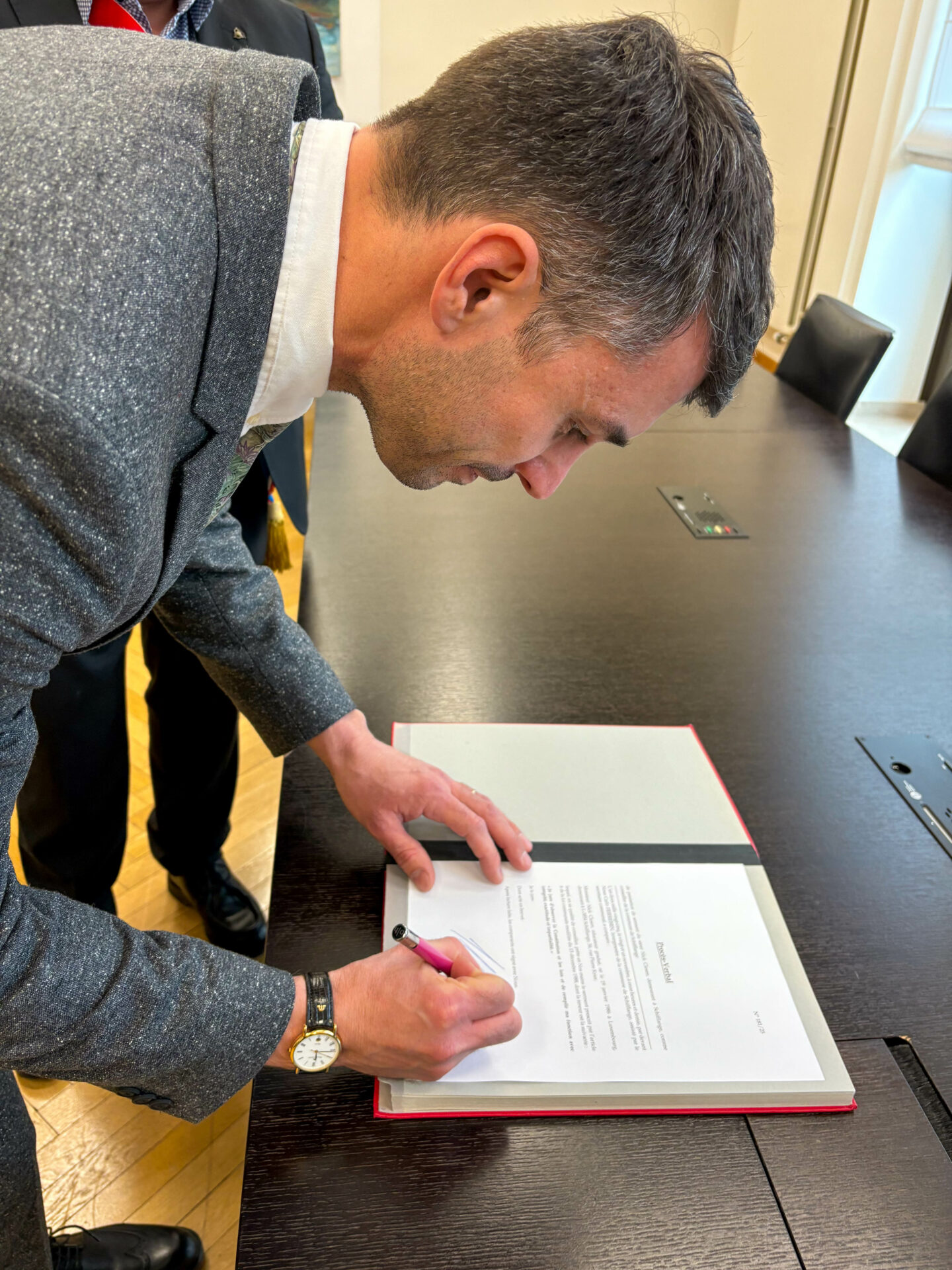 Nachdem Herr Albert Kalmes von der Partei déi Gréng, der vom 25.11.2011 bis zum 21.11.2017 als Gemeinderatsmitglied, vom 22.11.2017 bis zum 13.07.2023 als Schöffe und vom 14.07.2023 bis zum 31.10.2025 erneut als Gemeinderatsmitglied im Dienst der Gemeinde tätig war, mit Wirkung zum 1. November 2025 als Gemeinderatsmitglied zurückgetreten ist, hat Herr Nick Clesen heute, am 21. November 2025, vor dem Bürgermeister Carlo Feiereisen und in Anwesenheit mehrerer Mitglieder des Schöffen- und Gemeinderats seinen Eid abgelegt.