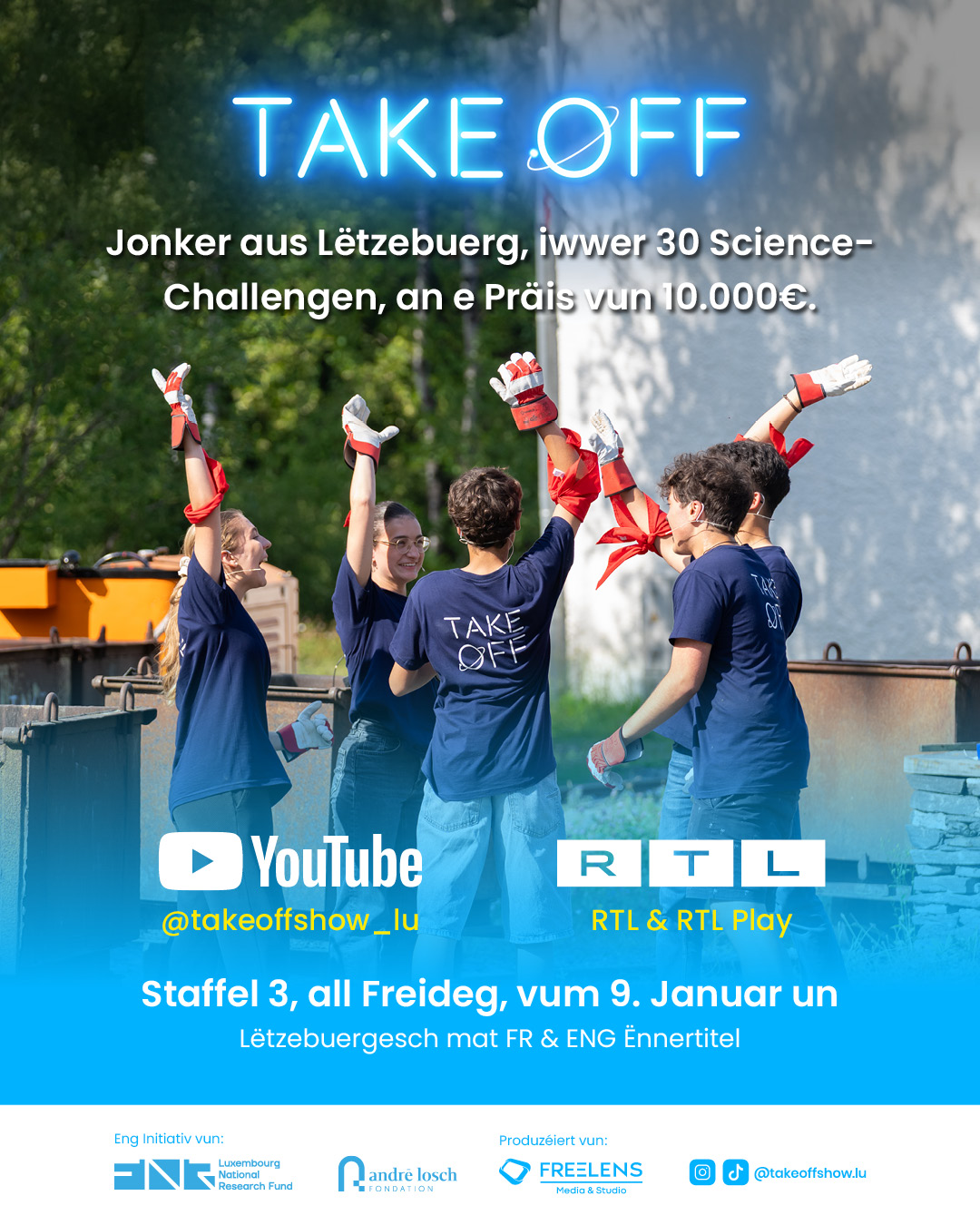 The Municipality of Schifflange is pleased to announce that two young residents are taking part in the new season of the Take Off – Science Challenge Show. This exciting and educational science programme is a must-watch for the whole family. It highlights motivated young people aged 15 to 21 who take on demanding scientific challenges and demonstrate just how fascinating the world of science can be.