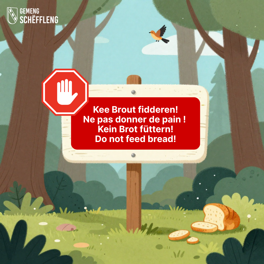 Och wann et gutt gemengt ass: Brout ka bei Villercher, Inten an aner Déieren zu schwéiere Verdauungsproblemer, Ënnerernierung an esouguer liewensgeféierleche Krankheete féieren. Fir d’Déieren an eis Natur ze schützen, ass et wichteg, kee Brout ze verdeelen – och net a klenge Quantitéiten.
