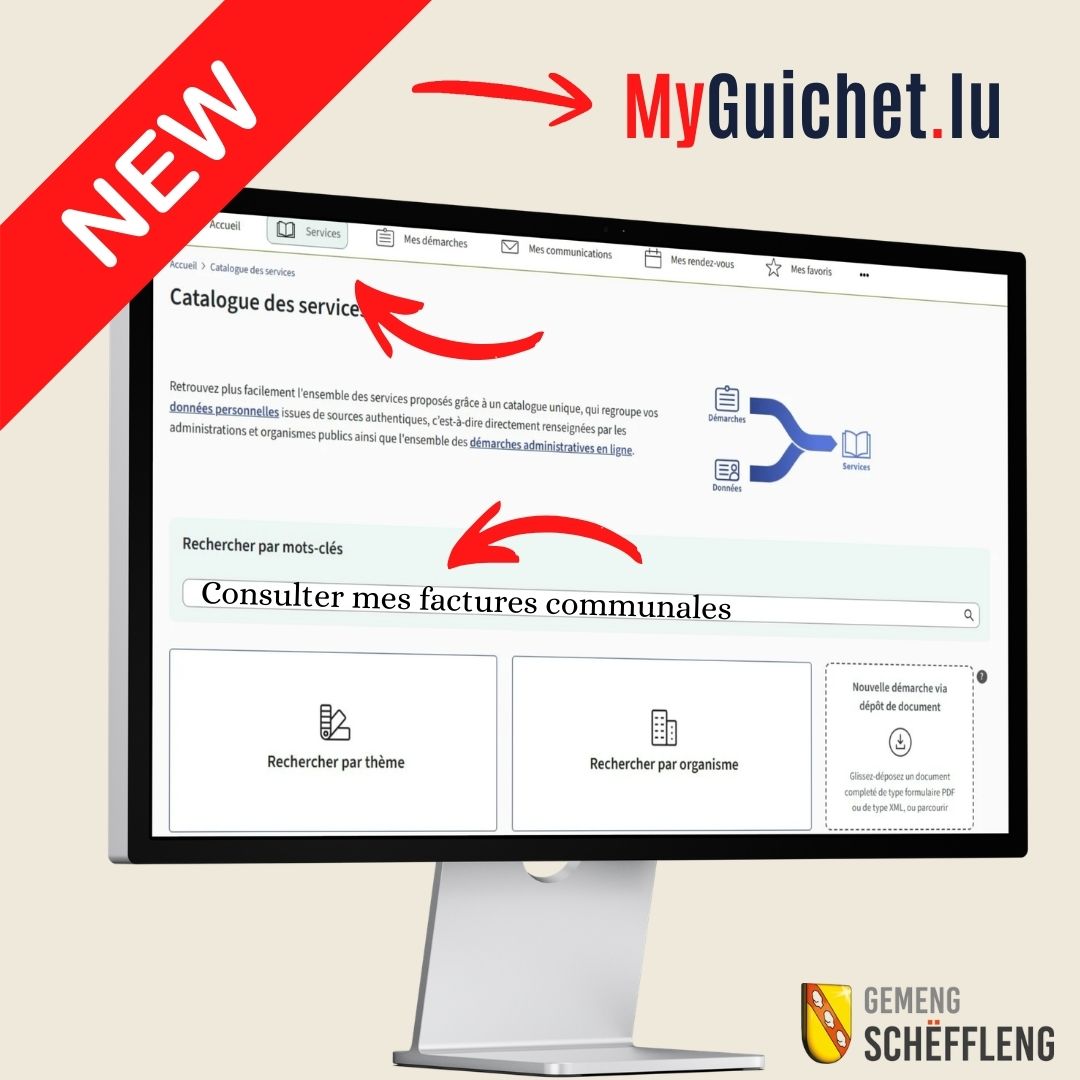 - MyGuichet.lu: Loggt Iech an Äre Kont an. Wielt d’Rubrik „Catalogue des services“, duerno „Consulter mes factures communales“ aginn a bestätegt Är Preferenz ënnen op der Säit.