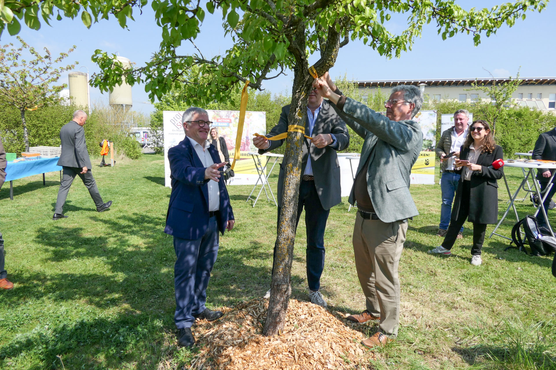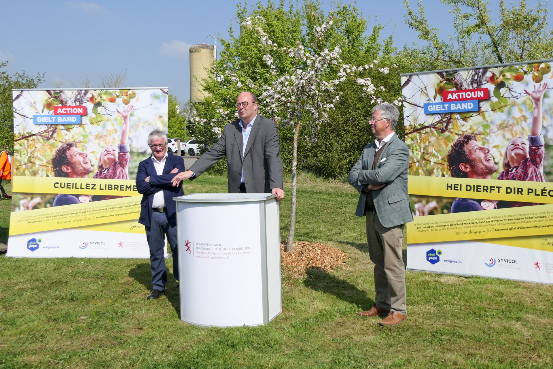 Les amateurs de bons fruits locaux ont de quoi se réjouir – l’action « Gielt Band – Hei dierft Dir plécken! » est une initiative du ministère de l’Agriculture, de la, Viticulture et du Développement rural ensemble avec le Syndicat des villes et communes luxembourgeoises (Syvicol), dont la 2e édition de cette campagne anti-gaspillage a été lancée le 27 avril 2022 dans le verger communal à Schifflange situé dans la rue de Hédange.