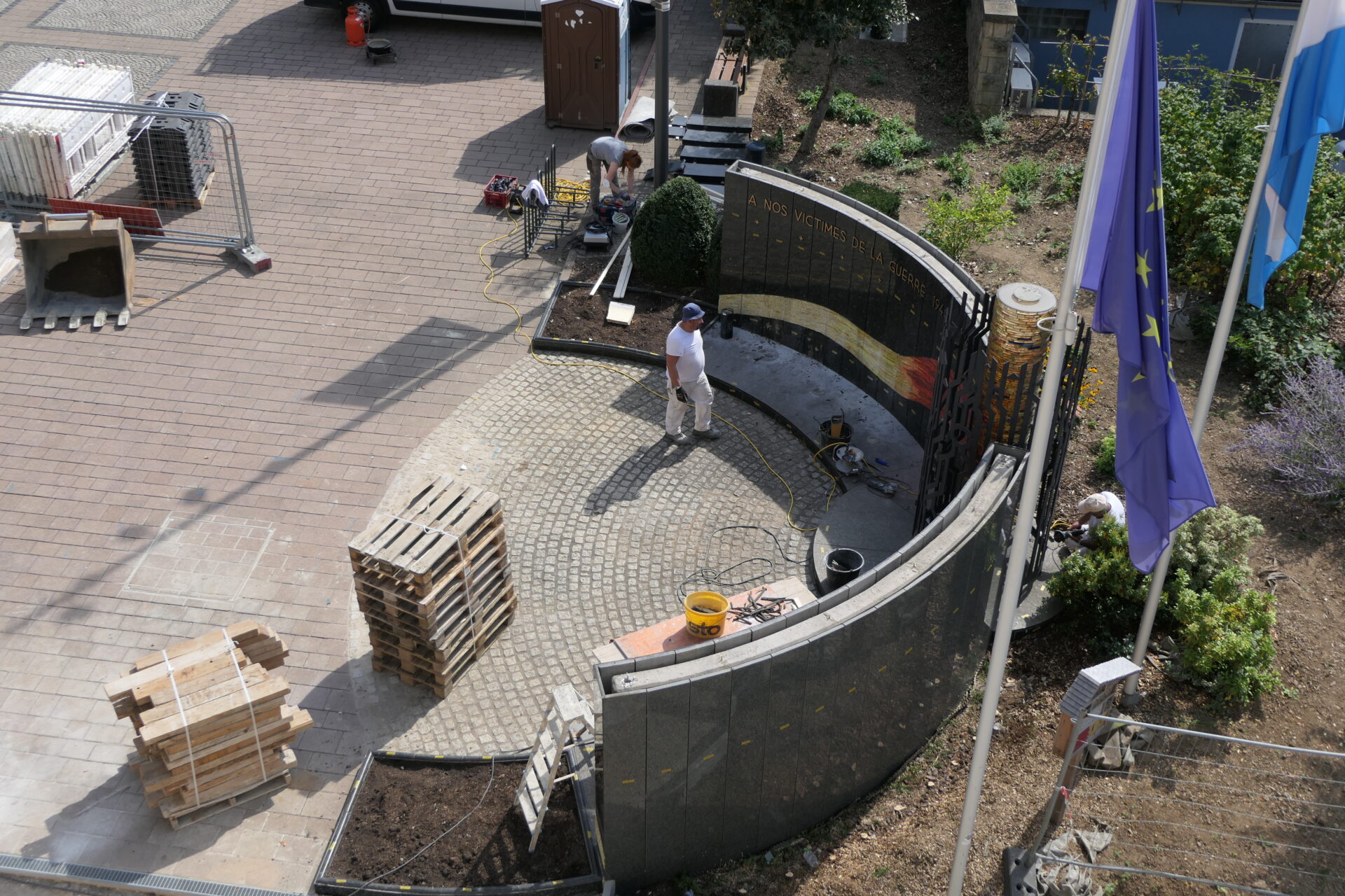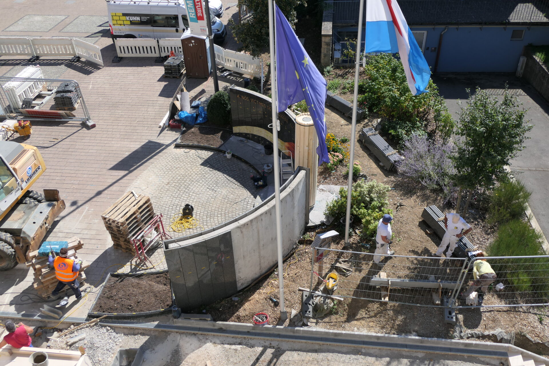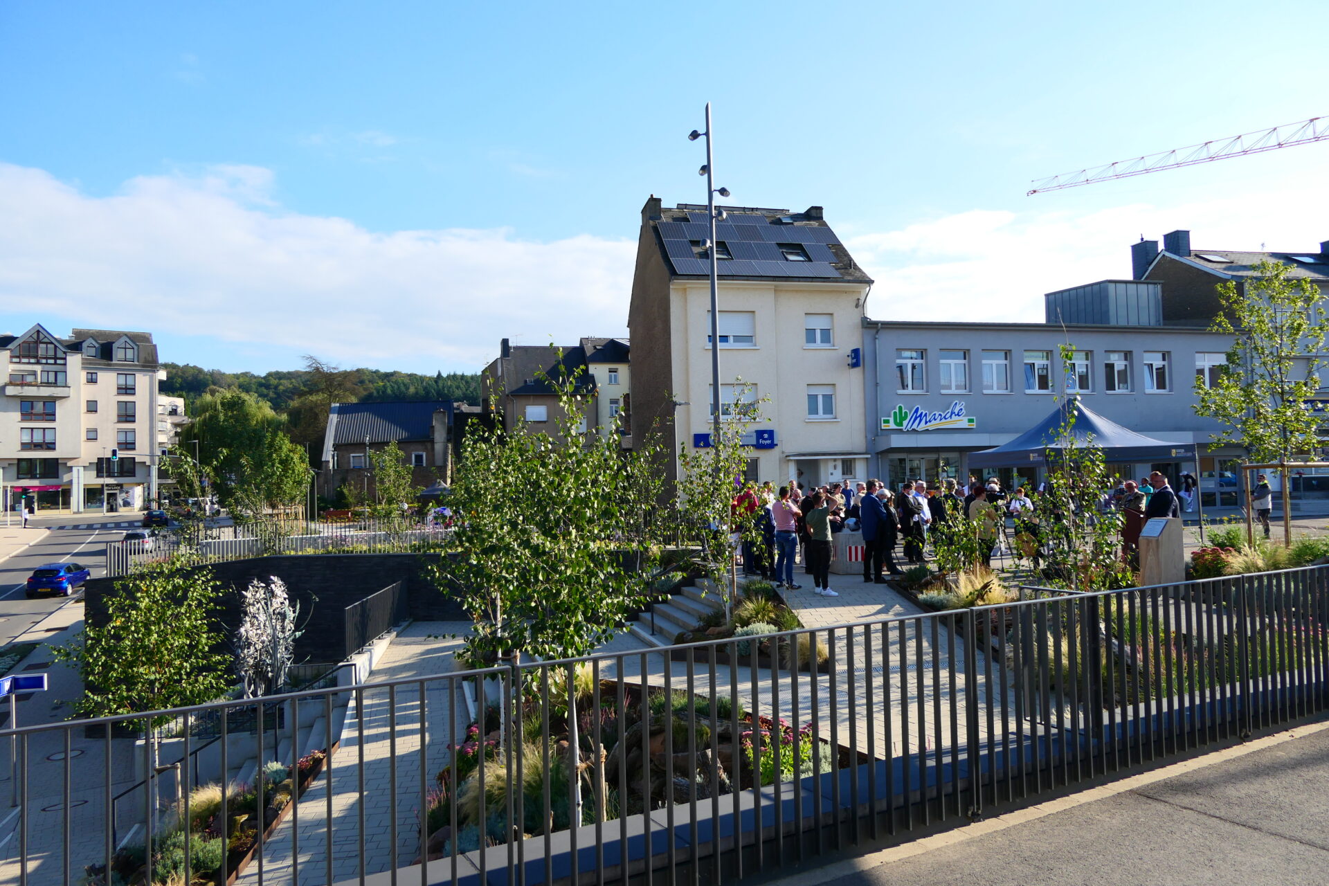 Dës nei Plaz ass en Deel vun engem gréissere Chantier (Reamenagement vum Parking an der Aloyse Kayser Strooss), deen och deemnächst fäerdeg gestallt soll ginn, a gëtt dëser symbolescher Entrée an de Kär vu Schëffleng eran dee Look, deen e verdéngt.