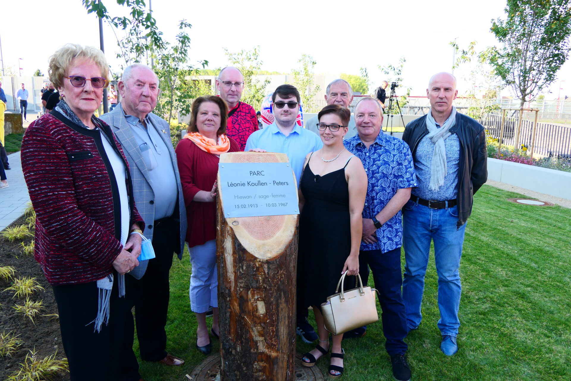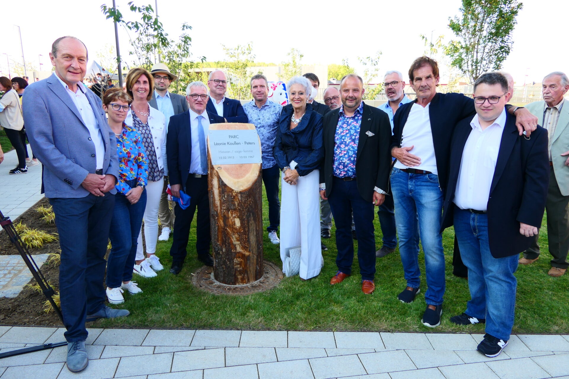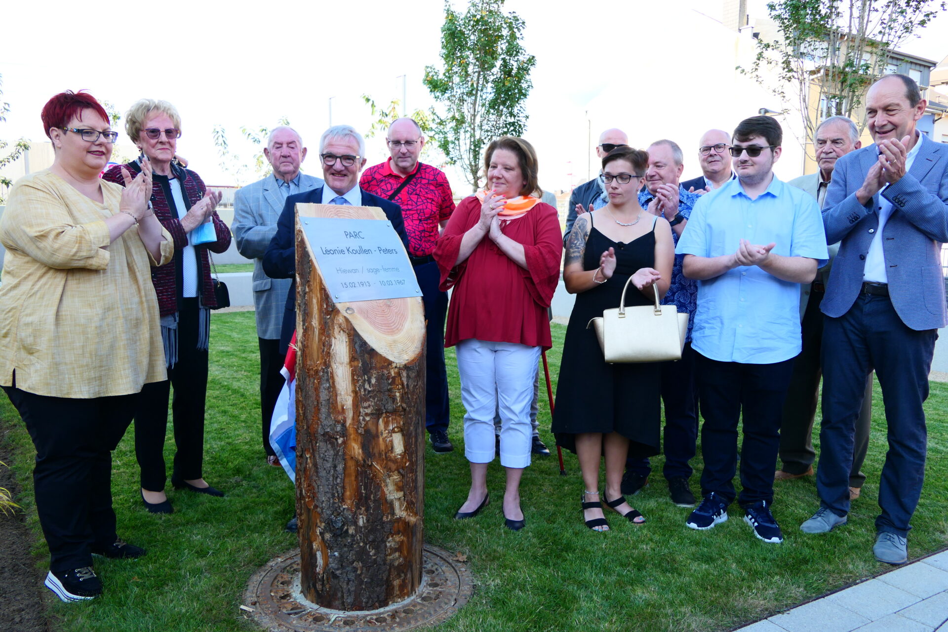Bei beschtem Wieder huet den Här Buergermeeschter d’Invitéeën empfaang an erkläert wéi houfreg d’Gemeng ass, dëse Park där Madamm (1913-1967) ze widmen, déi ganz ville Kanner zu Schëffleng gehollef huet, d’Liicht vun der Welt z’erblécken. Zu där spezieller Geleeënheet war och d’Famill vun der Léonie Koullen sur Place an huet e puer Wuert iwwert di besonnesch Fra zum Beschte ginn. Frou ware mir iwwert d’Präsenz vun deem éischten an deem leschte Puppelchen, déi bei der Hiewan zu Schëffleng op d’Welt komm sinn.