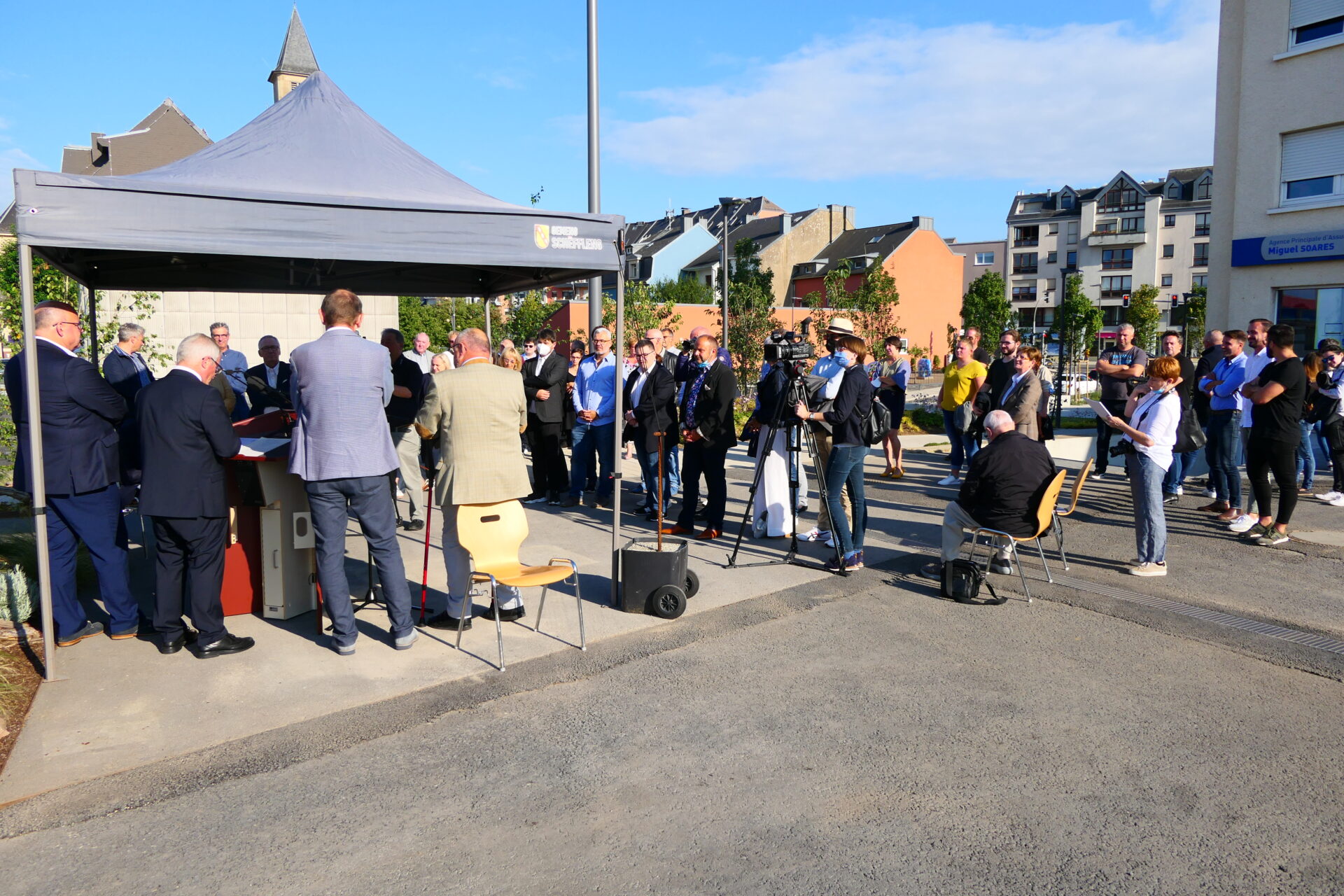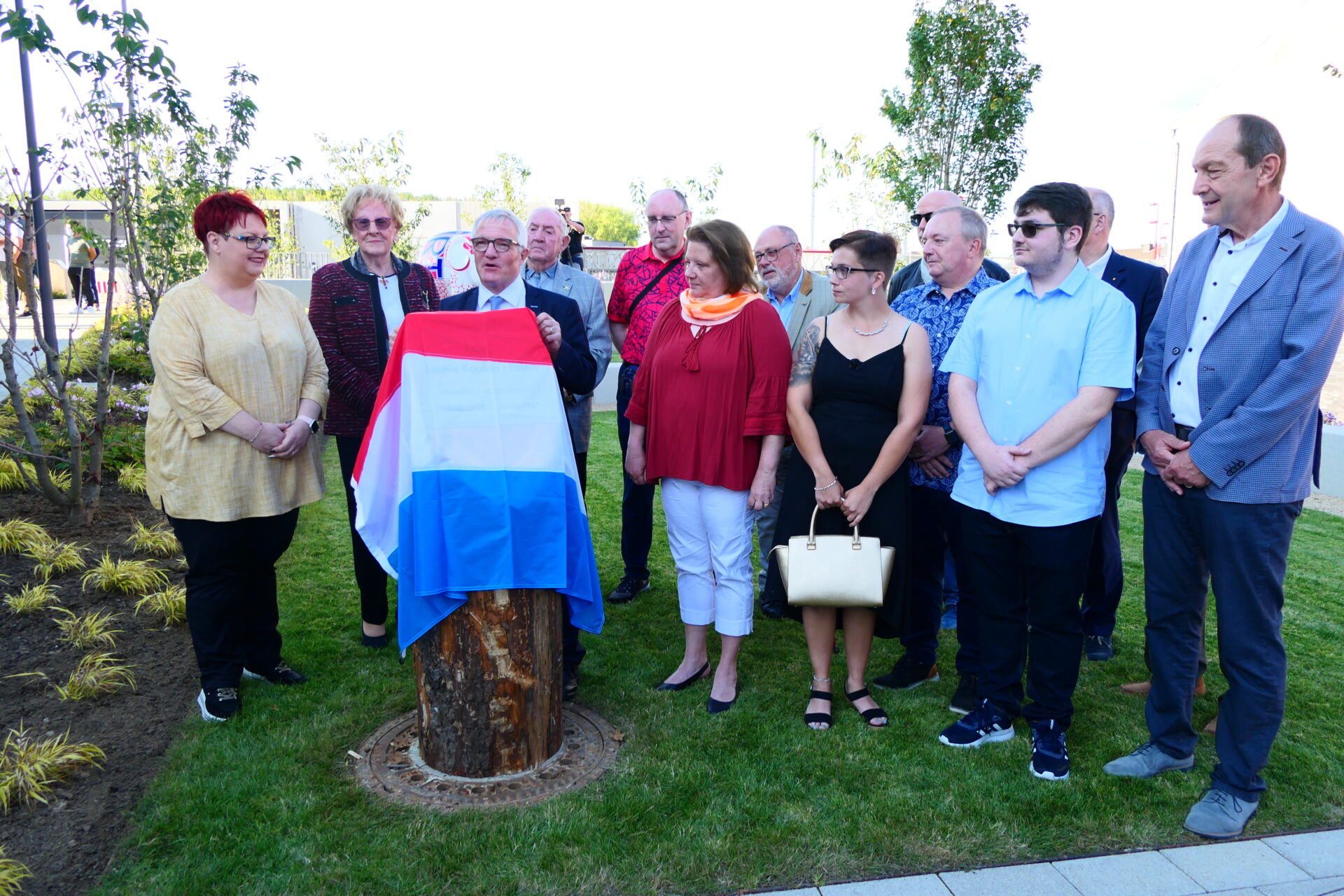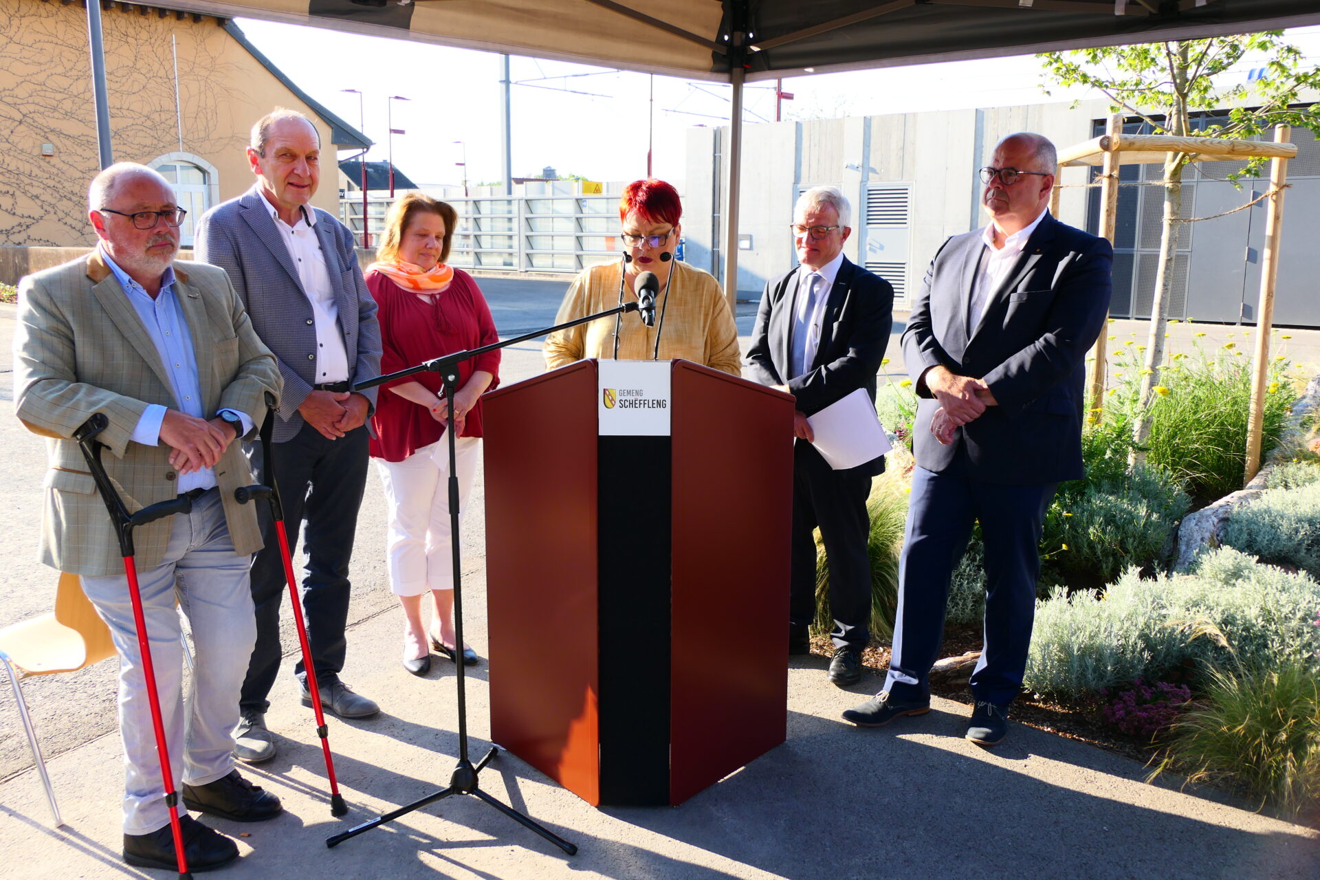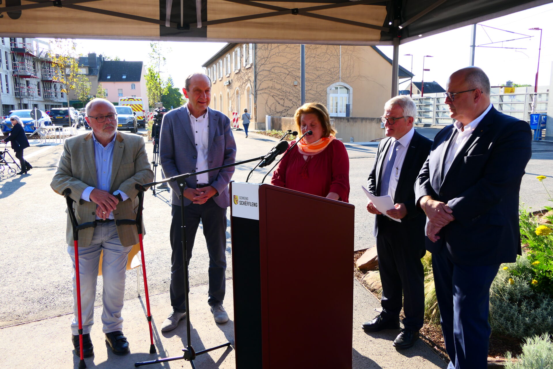 Bei beschtem Wieder huet den Här Buergermeeschter d’Invitéeën empfaang an erkläert wéi houfreg d’Gemeng ass, dëse Park där Madamm (1913-1967) ze widmen, déi ganz ville Kanner zu Schëffleng gehollef huet, d’Liicht vun der Welt z’erblécken. Zu där spezieller Geleeënheet war och d’Famill vun der Léonie Koullen sur Place an huet e puer Wuert iwwert di besonnesch Fra zum Beschte ginn. Frou ware mir iwwert d’Präsenz vun deem éischten an deem leschte Puppelchen, déi bei der Hiewan zu Schëffleng op d’Welt komm sinn.