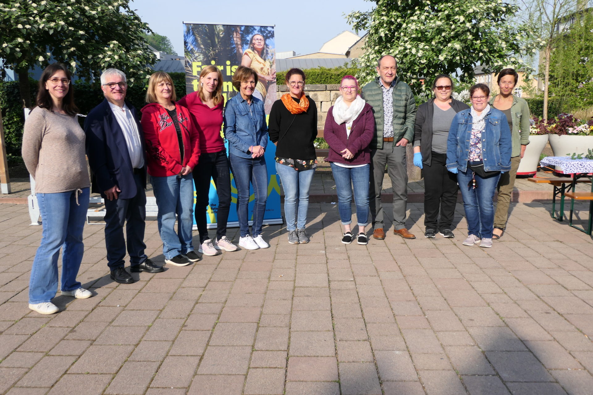Notre équipe de l’atelier communal avec leurs vêtements Fairtrade / Eis Ekipp vum Gemengenatelier mat hire Fairtradekleeder:
